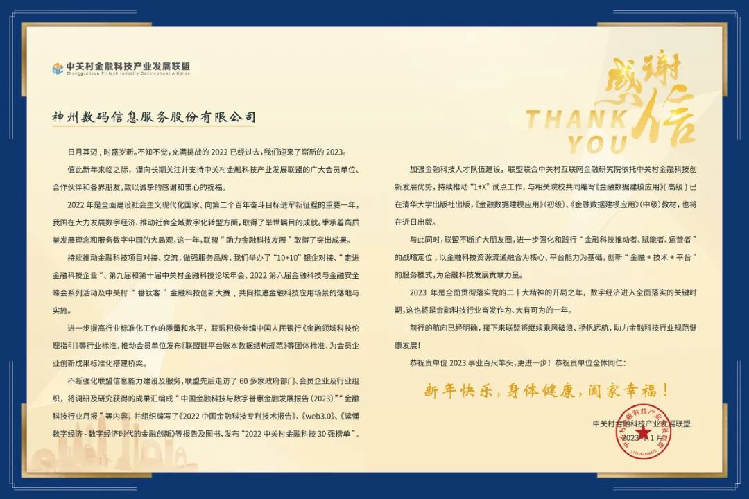 中关村金融科技产业发展联盟致神州信息的感谢信