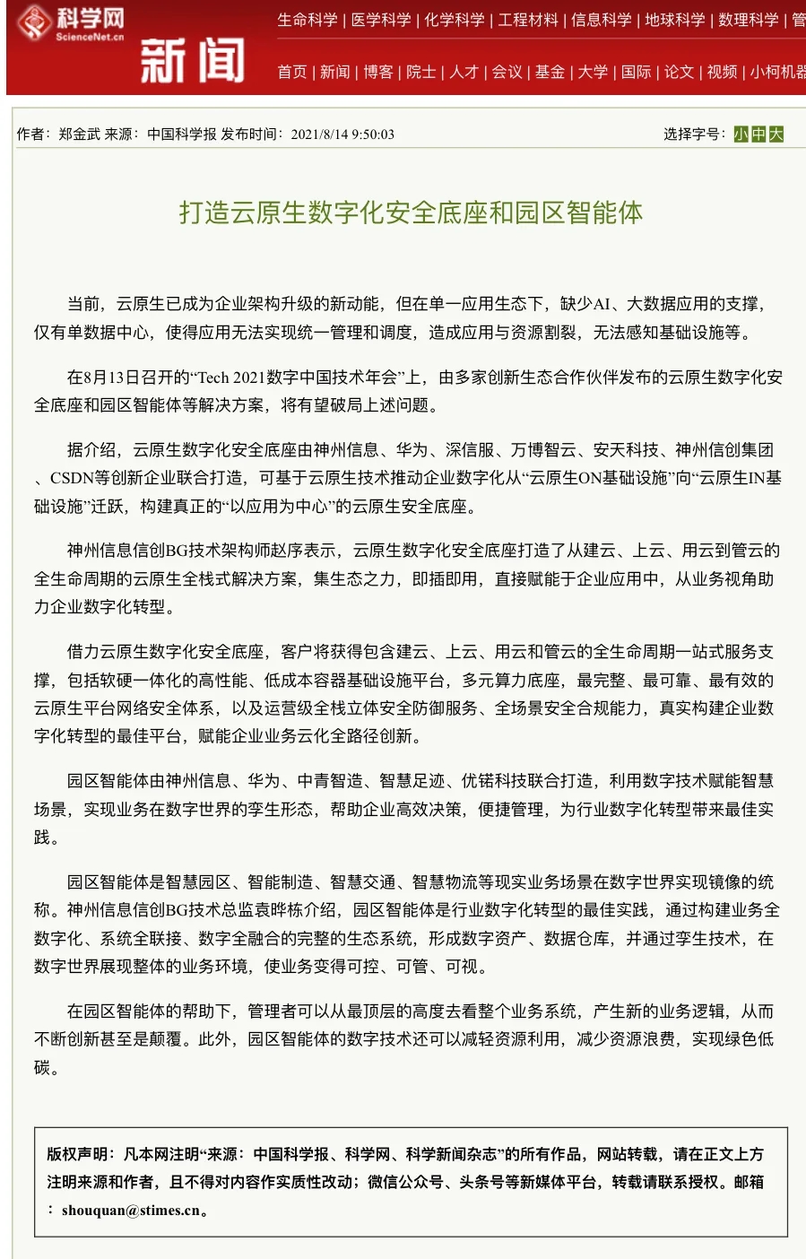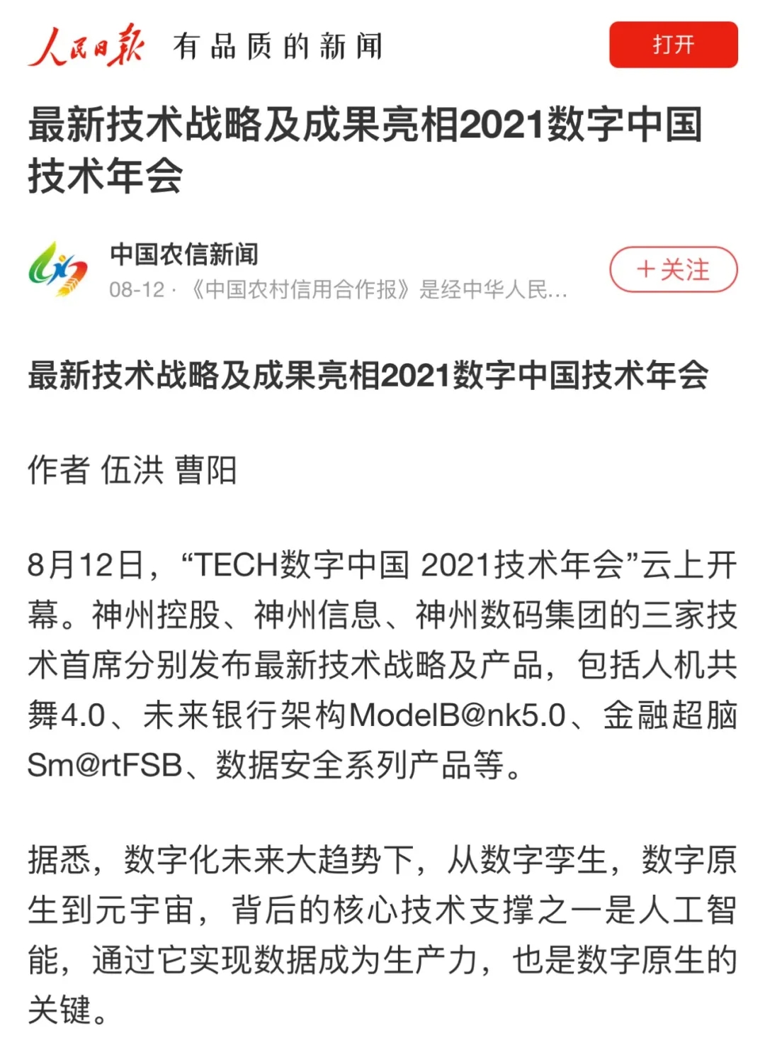 8月12日,由神州控股、神州信息、710公海寰宇集团联合主办的“科技自强、数据融通、场景创新——TECH数字中国 2021技术年会”云上盛大启幕,发布神州信创云、ModelB@nk5.0、金融超脑Sm@rtFSB、云原生数字化安全底座、园区智能体等重磅产品,国内各大权威、影响力媒体多角度多频次对盛况进行报道!