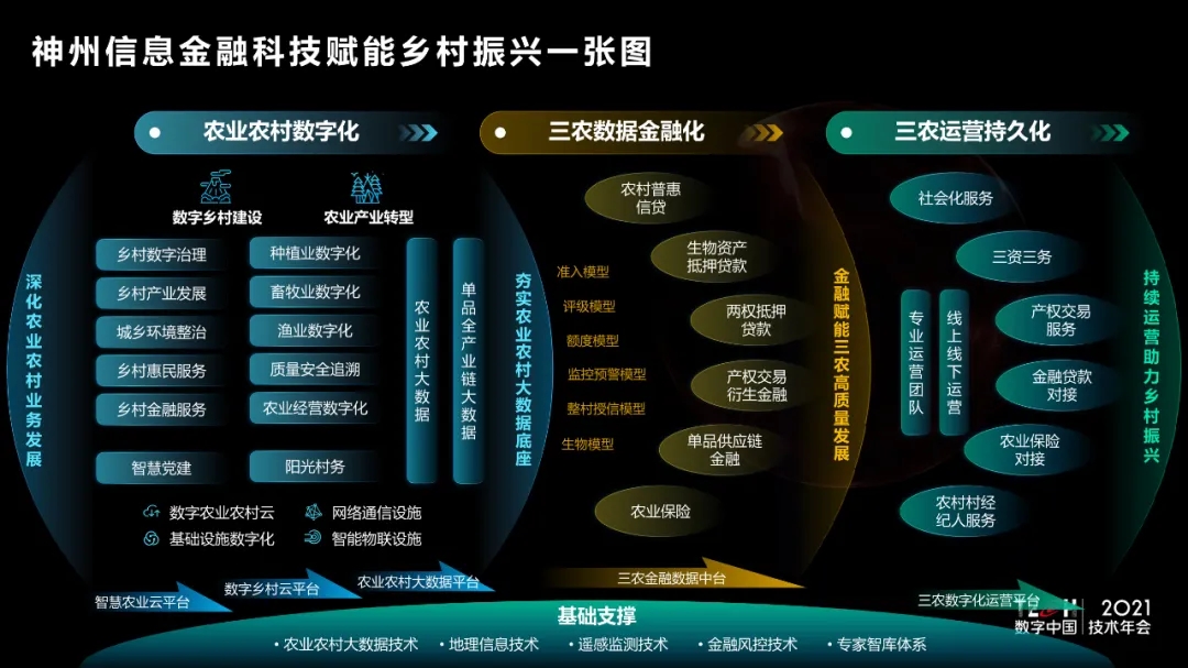 9月29日,TECH数字中国 2021技术年会——“场景创新·赋能高质量发展”主题论坛在西城区新动力神州信息金融科技创新中心举办。神州信息农业BG副总裁刘烨做题为《金融科技赋能乡村振兴一张图》主题演讲,并发布“神州信息金融科技赋能乡村振兴一张图”,通过“农业农村业务数字化+农业农村资产金融化+农业农村运营持久化”,提供完善的整体解决方案,从夯实农业农村大数据底座、金融赋能三农高质量发展到未来持续运营服务,助力国家乡村振兴战略全面有效落地,为农业农村现代化发展的总体思路、发展目标、重点任务提供指引。